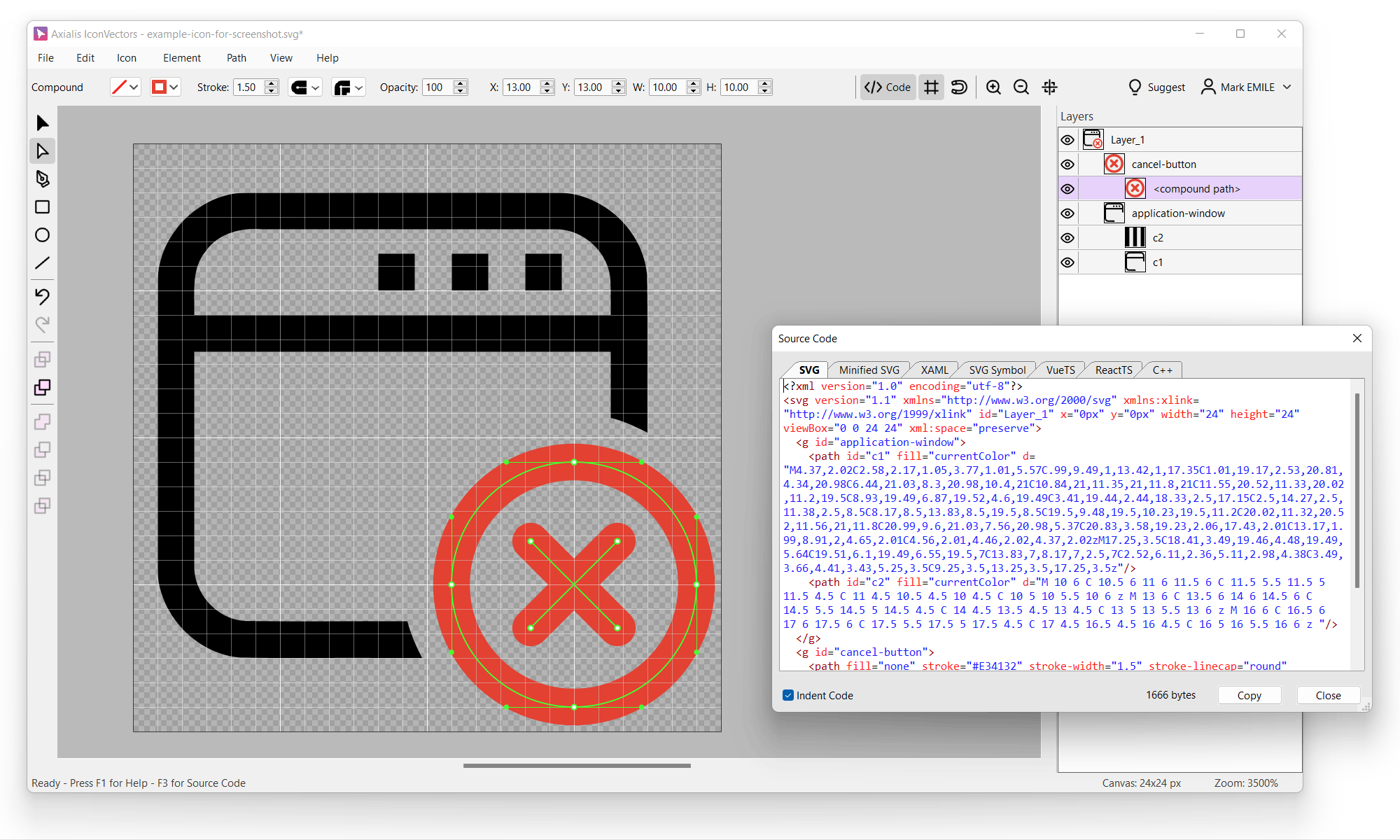 Export vectors to SVG, XAML, ReactTS, VueTS, C++, bitmaps to PNG, ICO, ICNS.