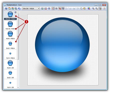 By changing the background lightness of the preview window (left-click in it), you can appreciate how Axialis IconWorkshop™ has resized the image and created perfect borders around the sphere object.