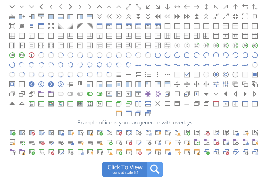 The icon set contains 230 unique icons and 279 overlays. This lets you create thousands of different icons for your all your needs. Below is a preview of the base icons without derivations Click here to see the full set at scale 5:1 with icon labels: