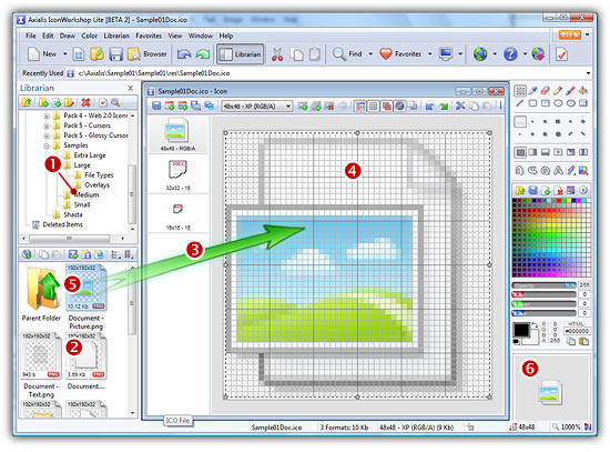 5. At this point, we could simply draw the icon as required. A better idea is to use the image objects to create a professional icon in a snap. We'll create a document window with a picture placed on it. The images formats we'll add in the icon will match the Windows XP requirements: