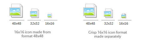 If you want create a professional icon, we recommend you to distinguish the images sizes 16x16 from the others. The 16x16 images must have less details and be more "crisp". See below the difference between a crisp 16x16 format and a normal one simply created from the 48x48 image:
